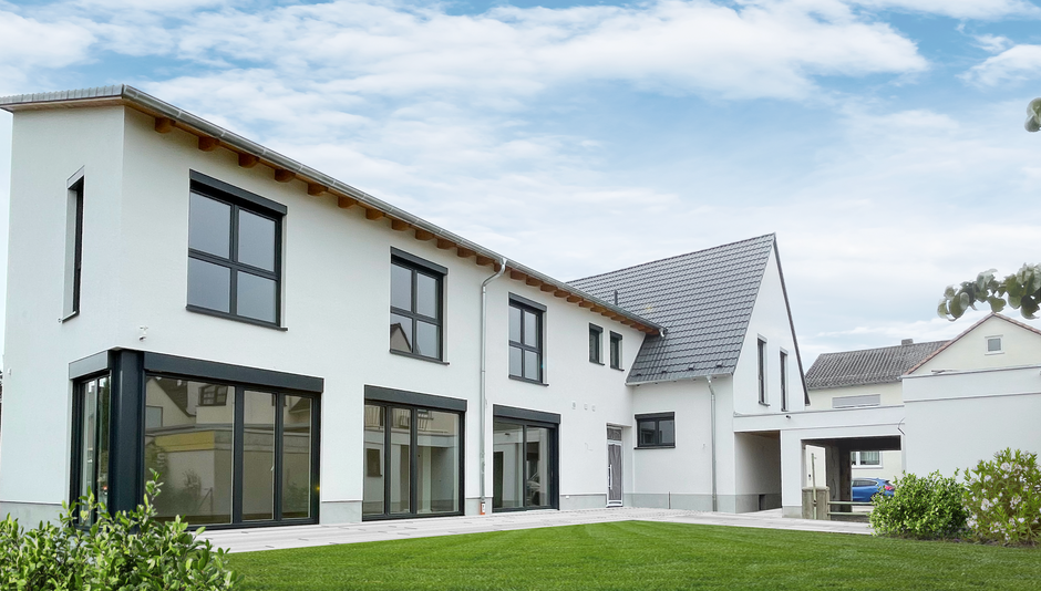 In Schifferstadt entstand im Jahre 2021 dieses sanierte Einfamilienhaus mit Erweiterung im Garten des großen Grundstücks. Es entstand über zwei Geschosse ein neues Domizil für die Familie, perfekt abgestimmt auf deren Bedürfnisse . Um 100 m² wurde die Wohnfläche des Altbestandes von 1950 auf 215 m² erweitert.